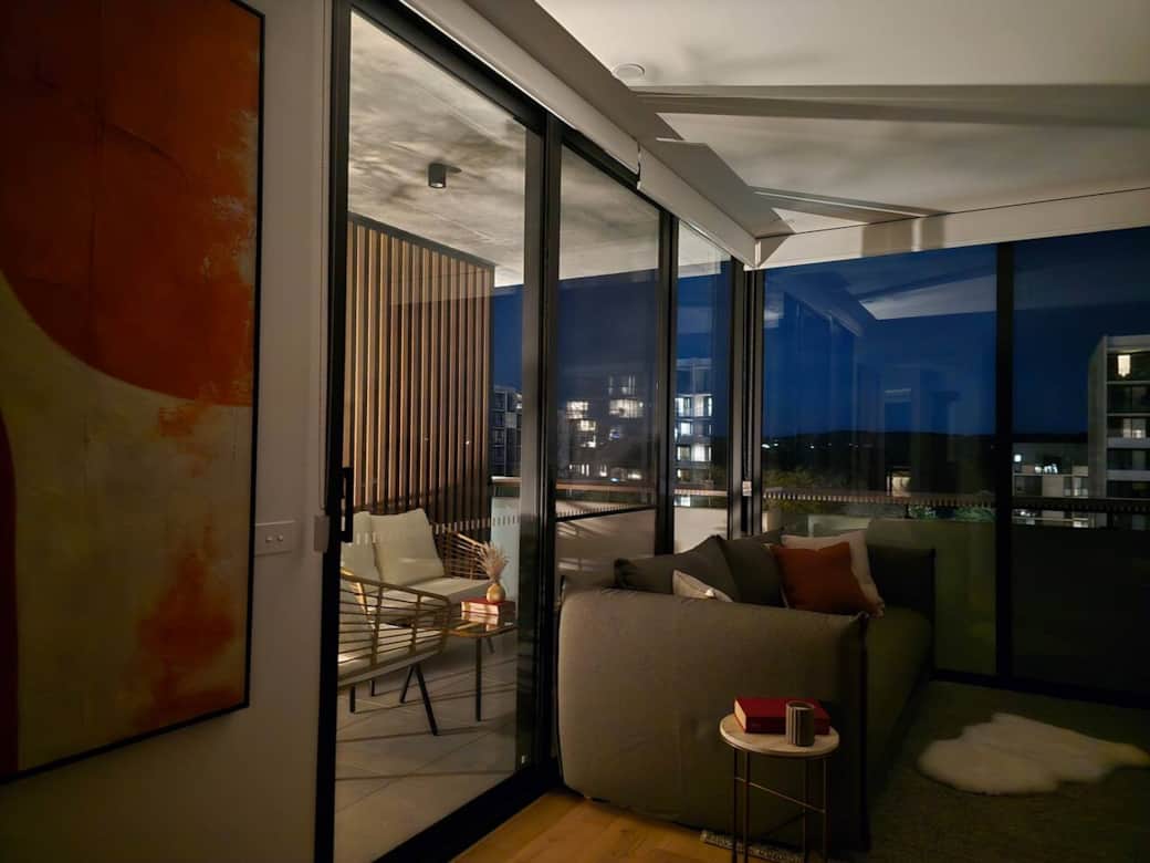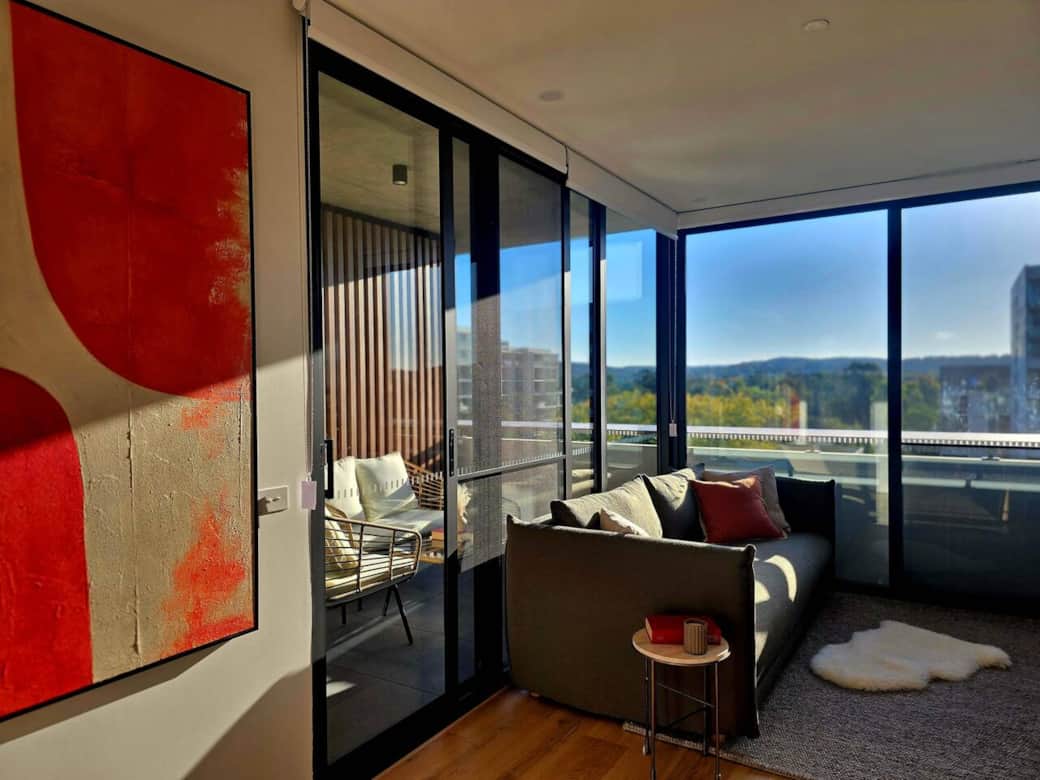 Step onto the private balcony and take in sweeping views across the city and Northbourne Avenue.